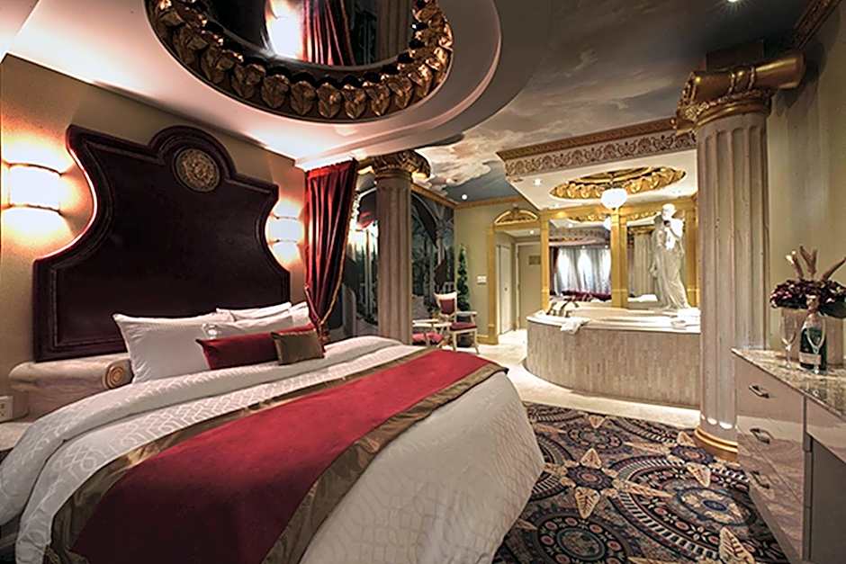 Featuring a Victorian coach theme, this room offers beds in mock horse drawn carriage and a 4 person hot tub. A 42" LCD TV with HDTV, mini refrigerator, coffee maker, safe, iron, and ironing board are provided. Free high speed WiFi is provided.